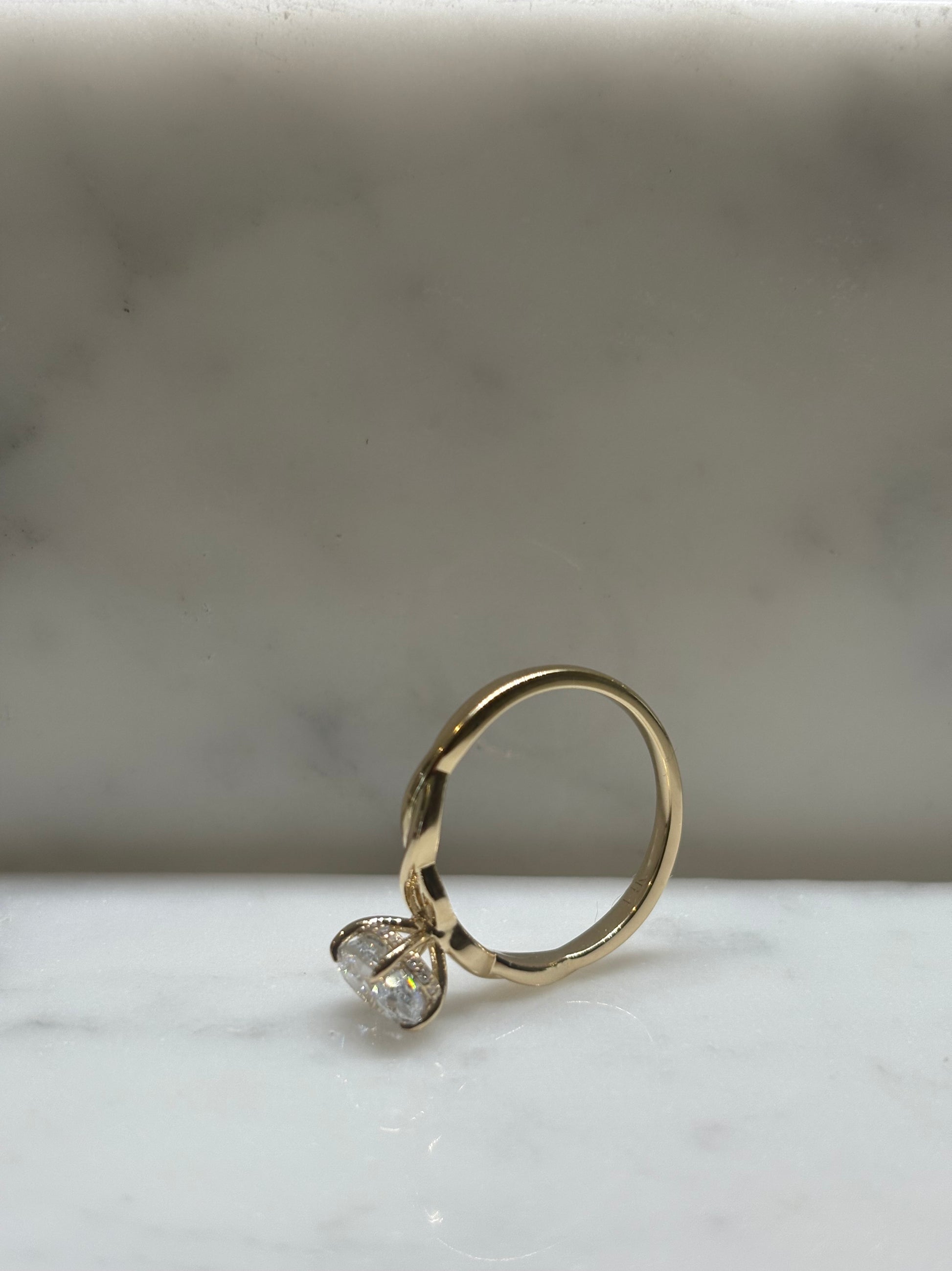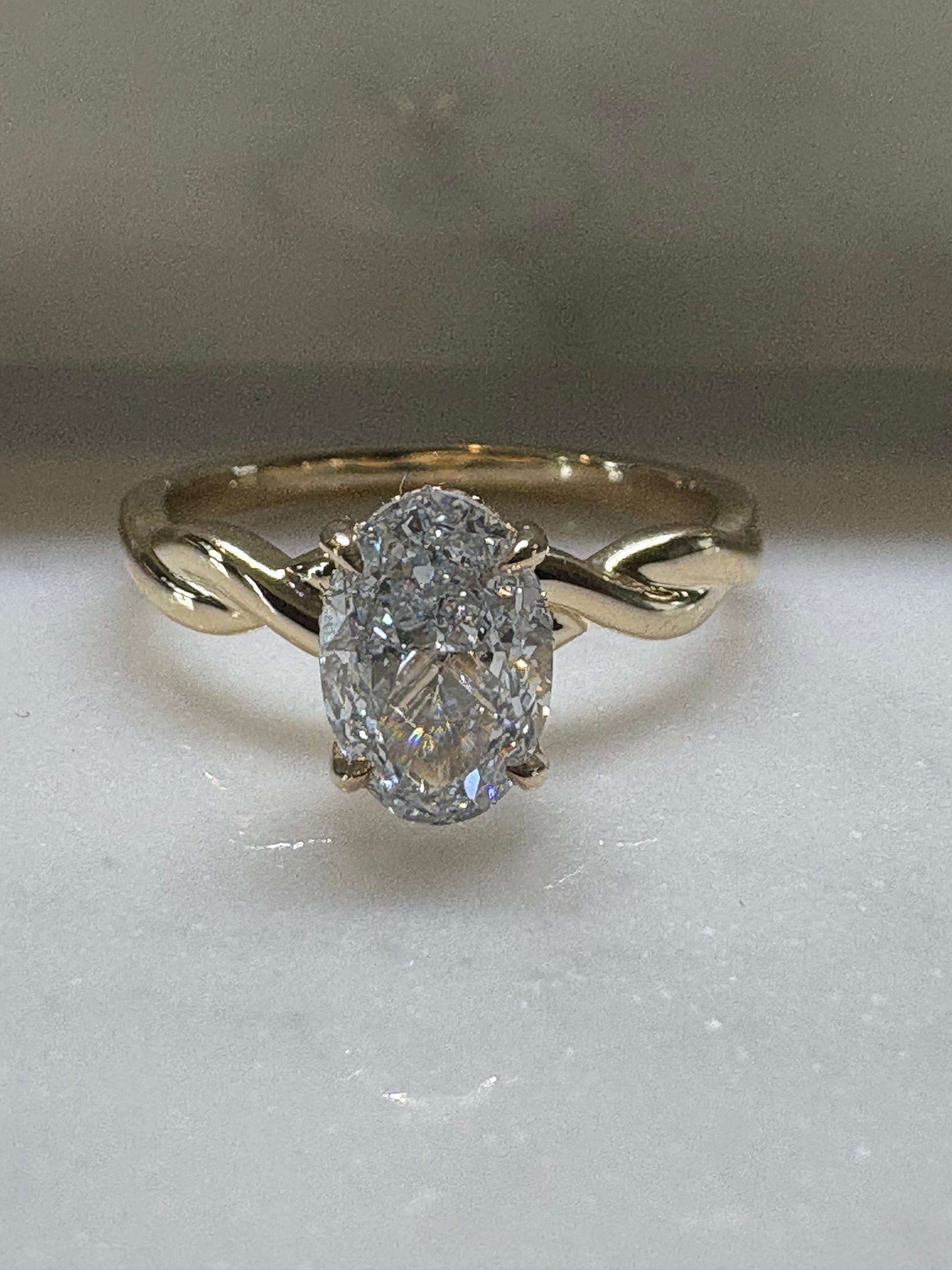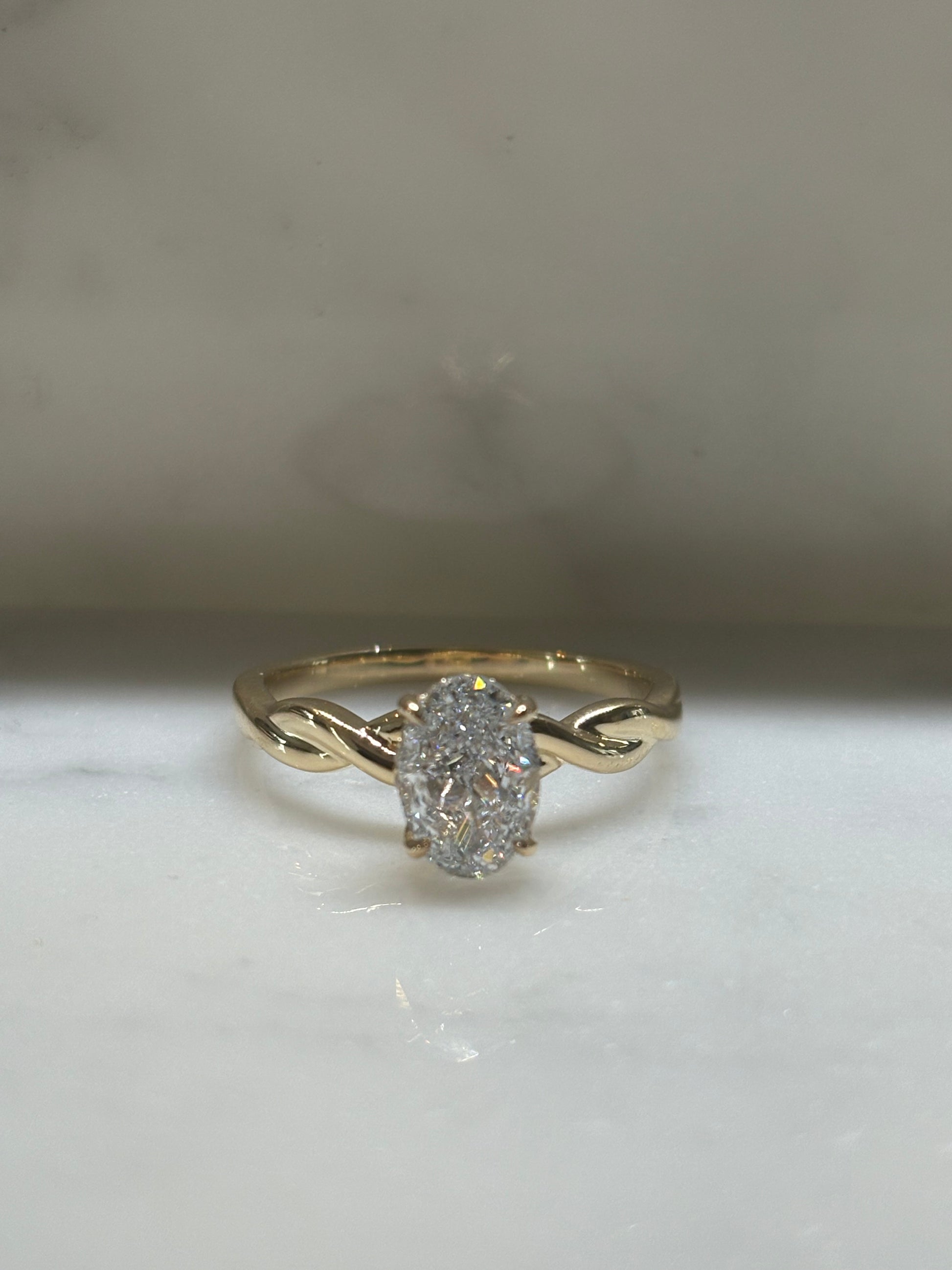 This twisted gold band flows gracefully toward a luminous oval-cut diamond, creating a sense of movement and harmony. Rounded prongs softly cradle the stone, allowing light to enhance its brilliance while maintaining a smooth, refined profile. Timeless and symbolic, this ring is designed to be worn and cherished every day.