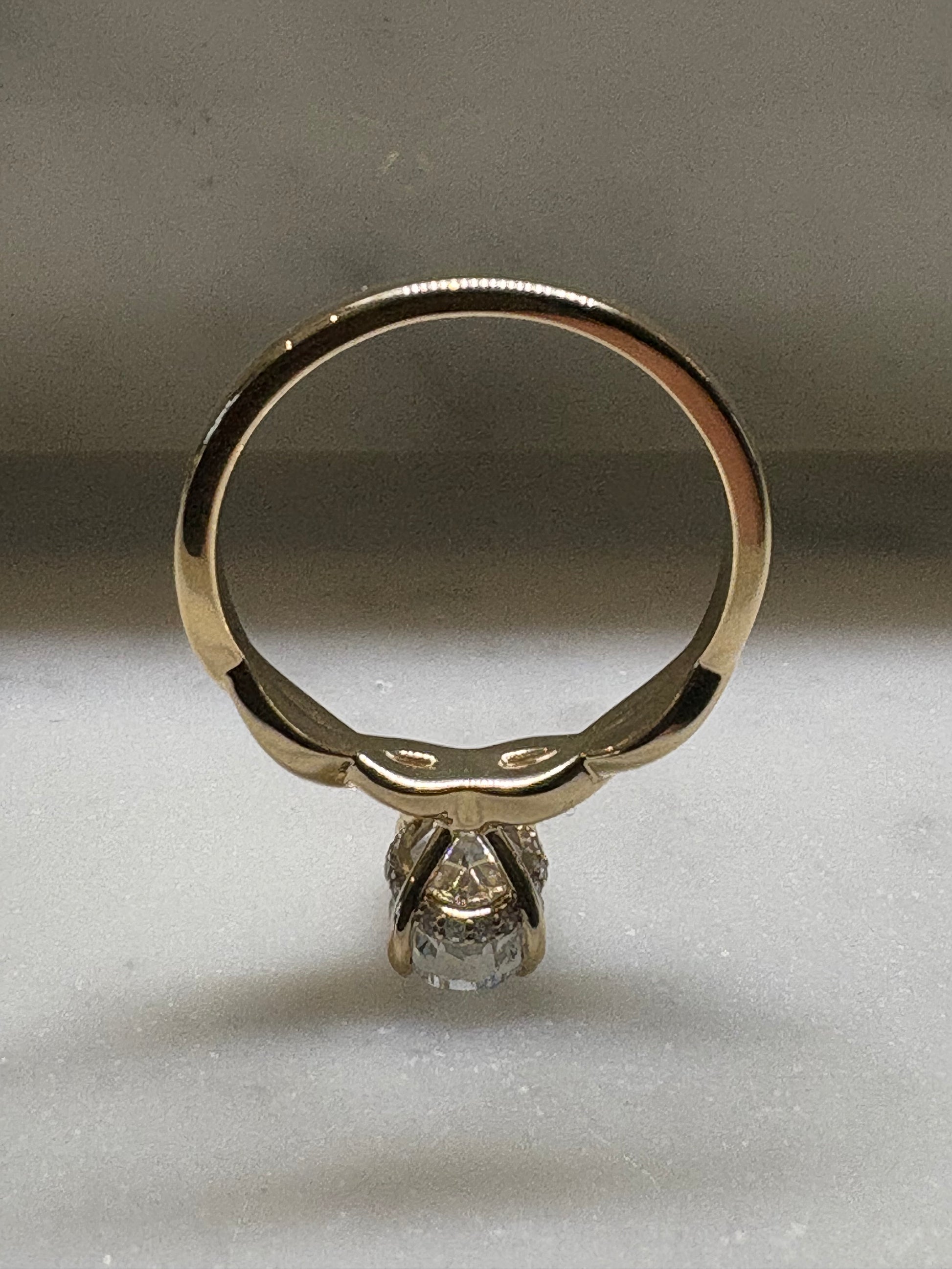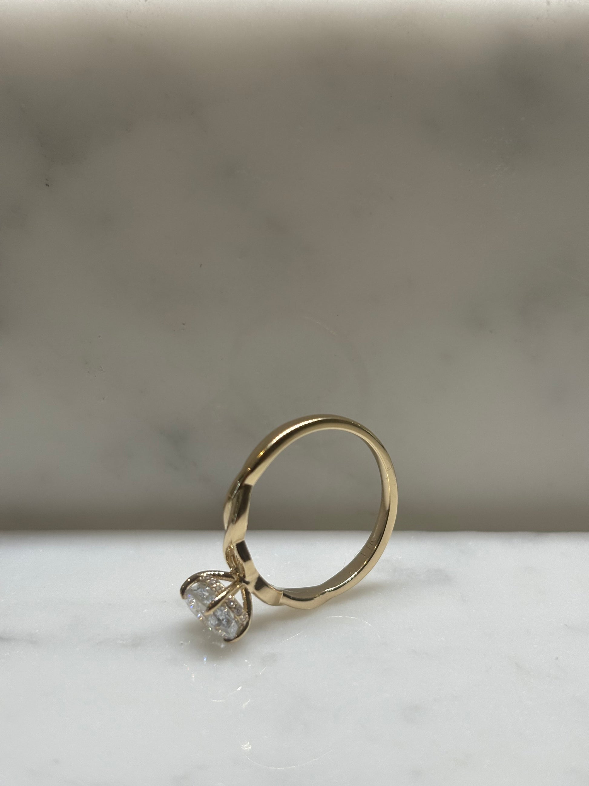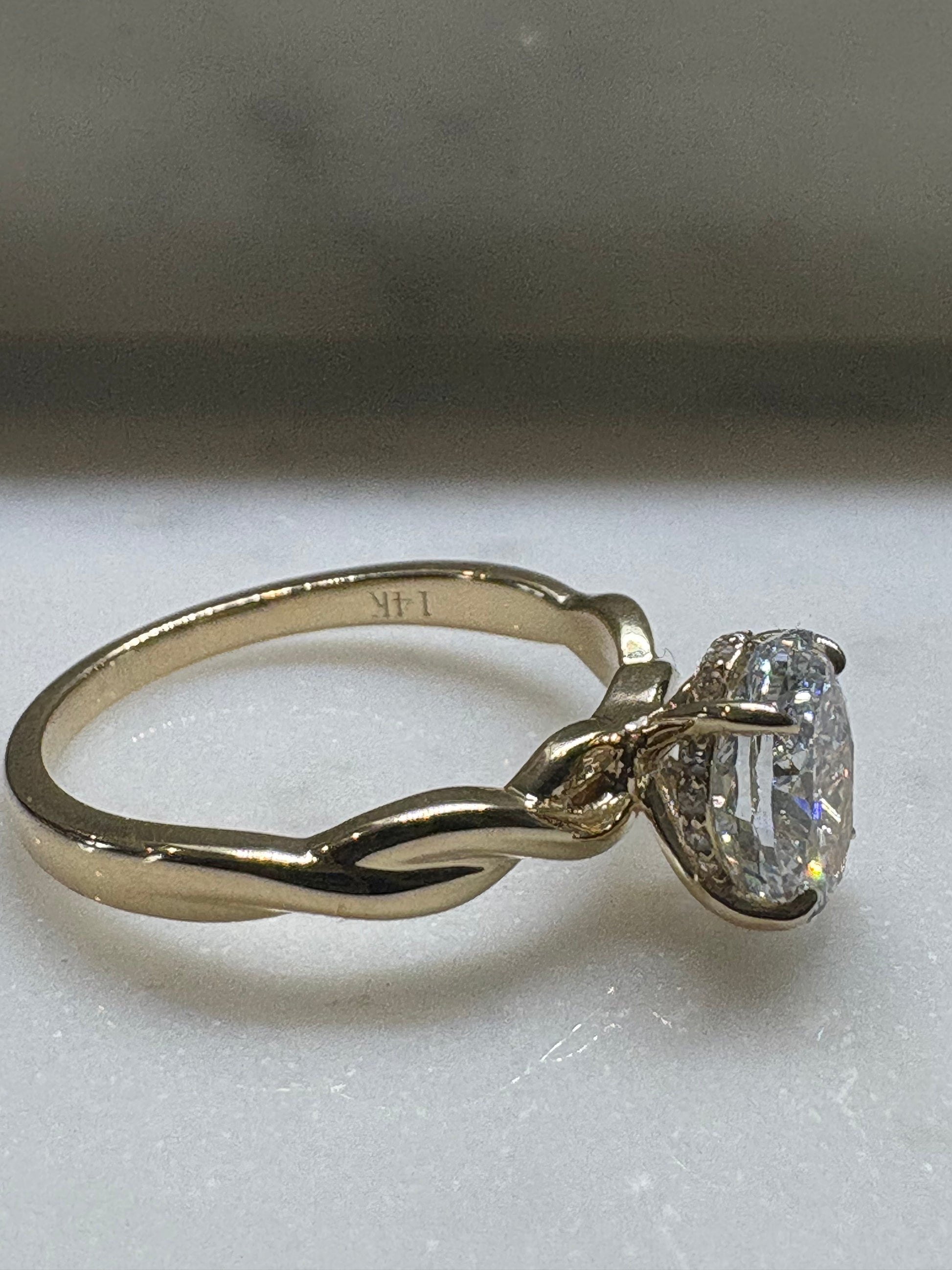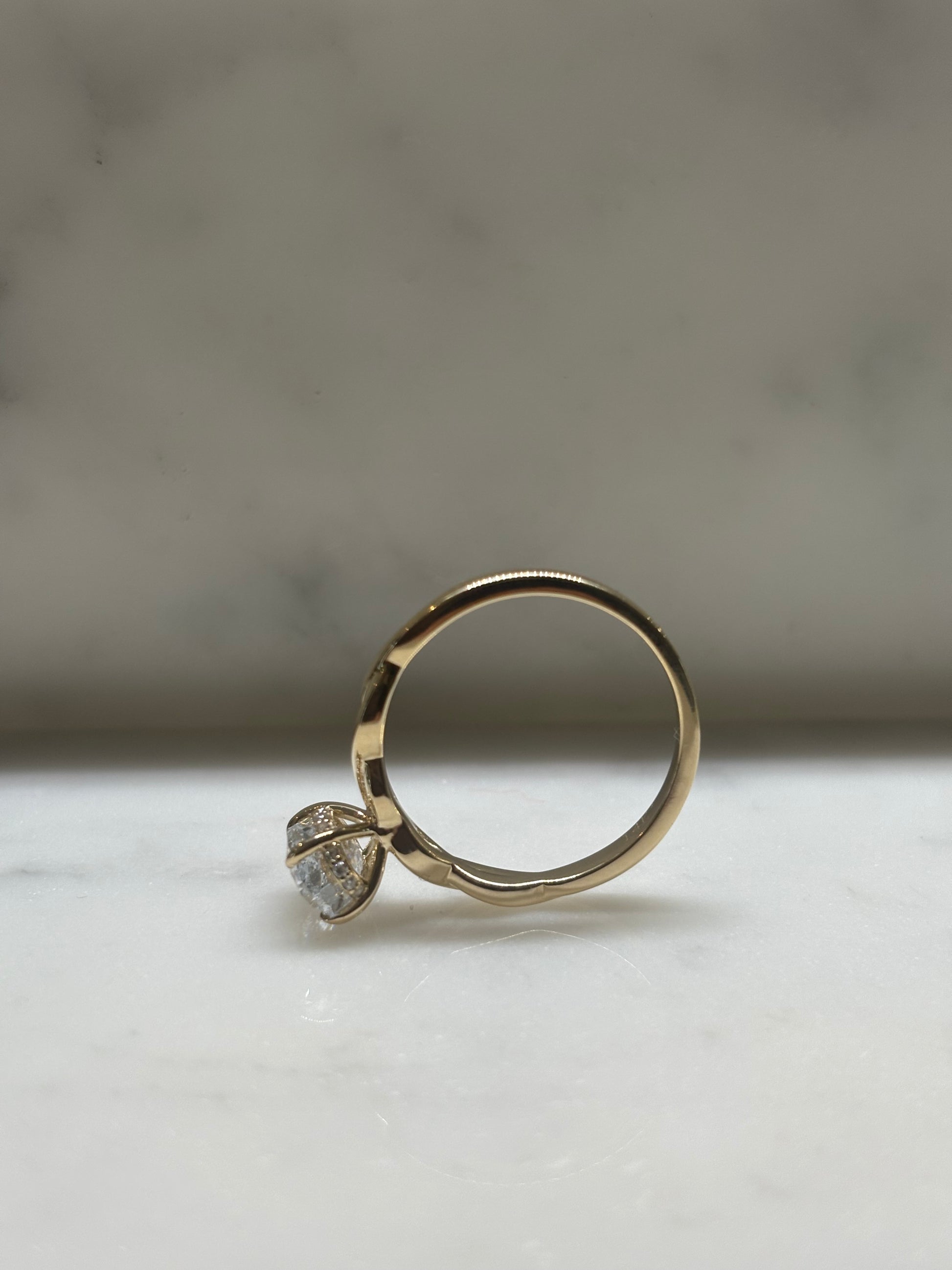 This twisted gold band flows gracefully toward a luminous oval-cut diamond, creating a sense of movement and harmony. Rounded prongs softly cradle the stone, allowing light to enhance its brilliance while maintaining a smooth, refined profile. Timeless and symbolic, this ring is designed to be worn and cherished every day.