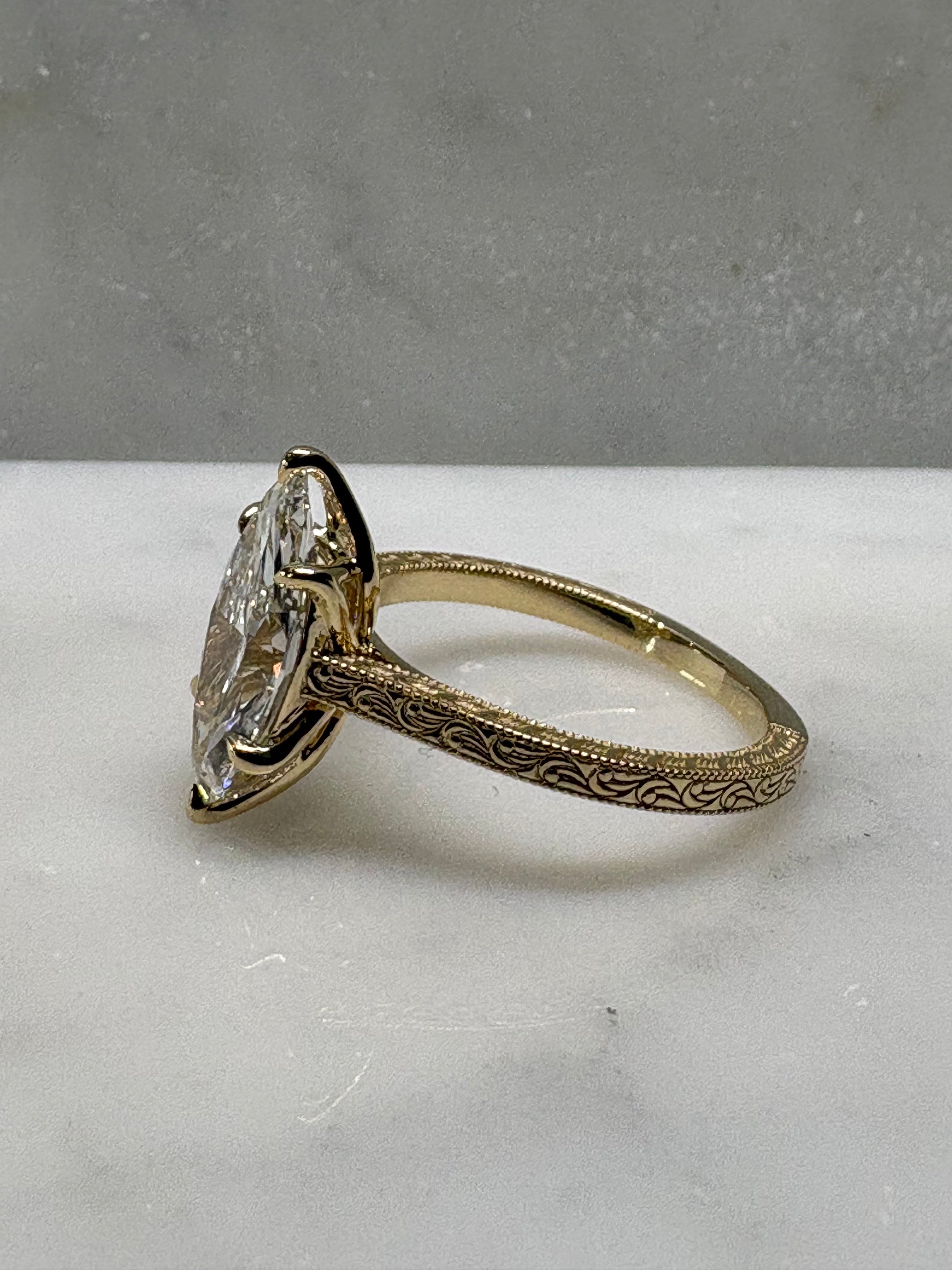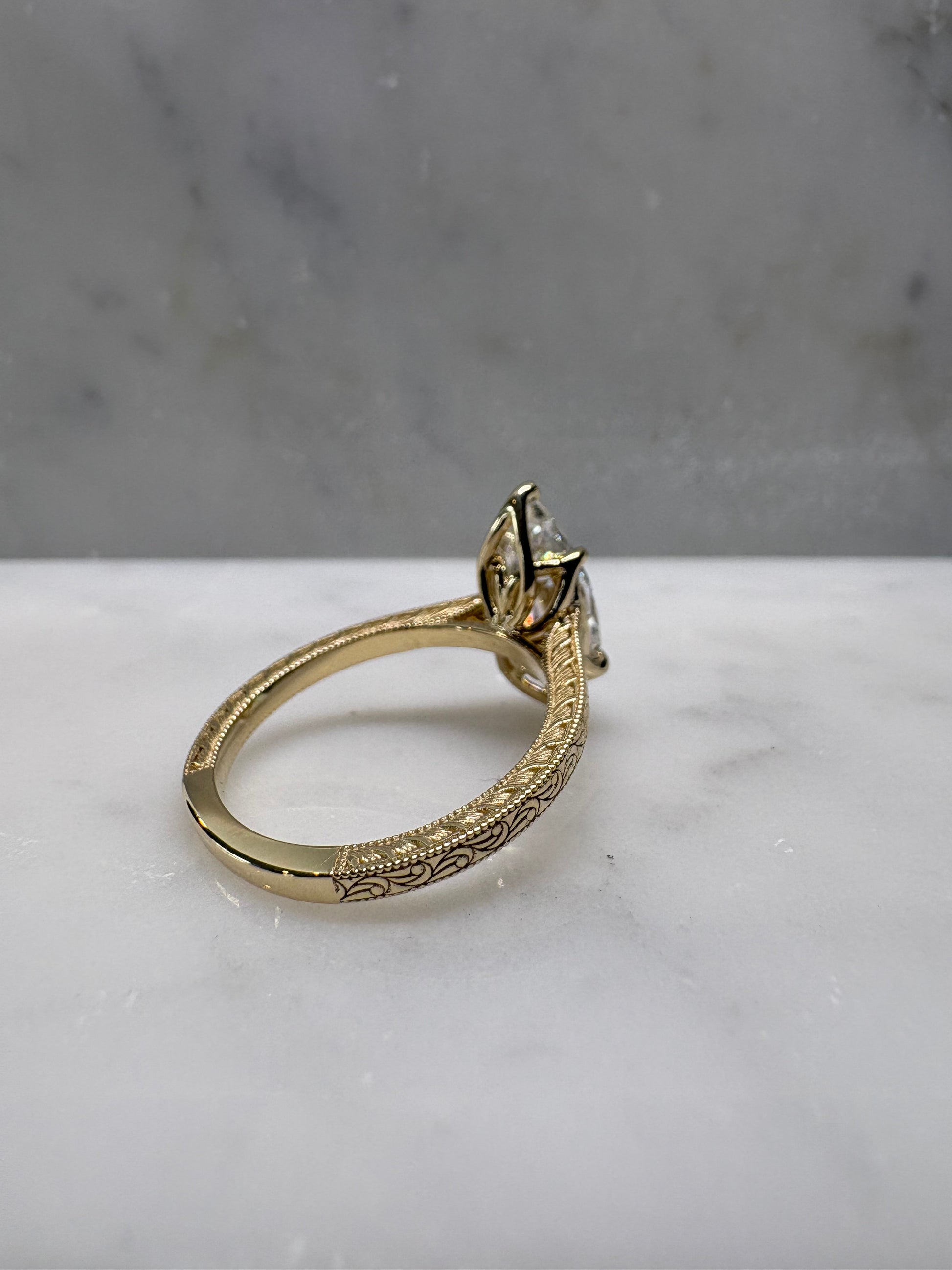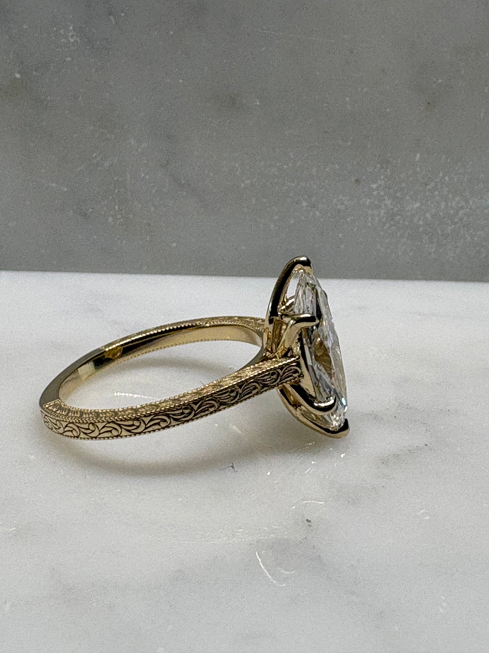 This ring features a 2.5 centre stone with a flower inspired bezel. Inspired by the Victorian era elevated form to show off the stunning centre done. The band is finished with continuous hand engraved detailing along the shoulders, echoing antique craftsmanship.