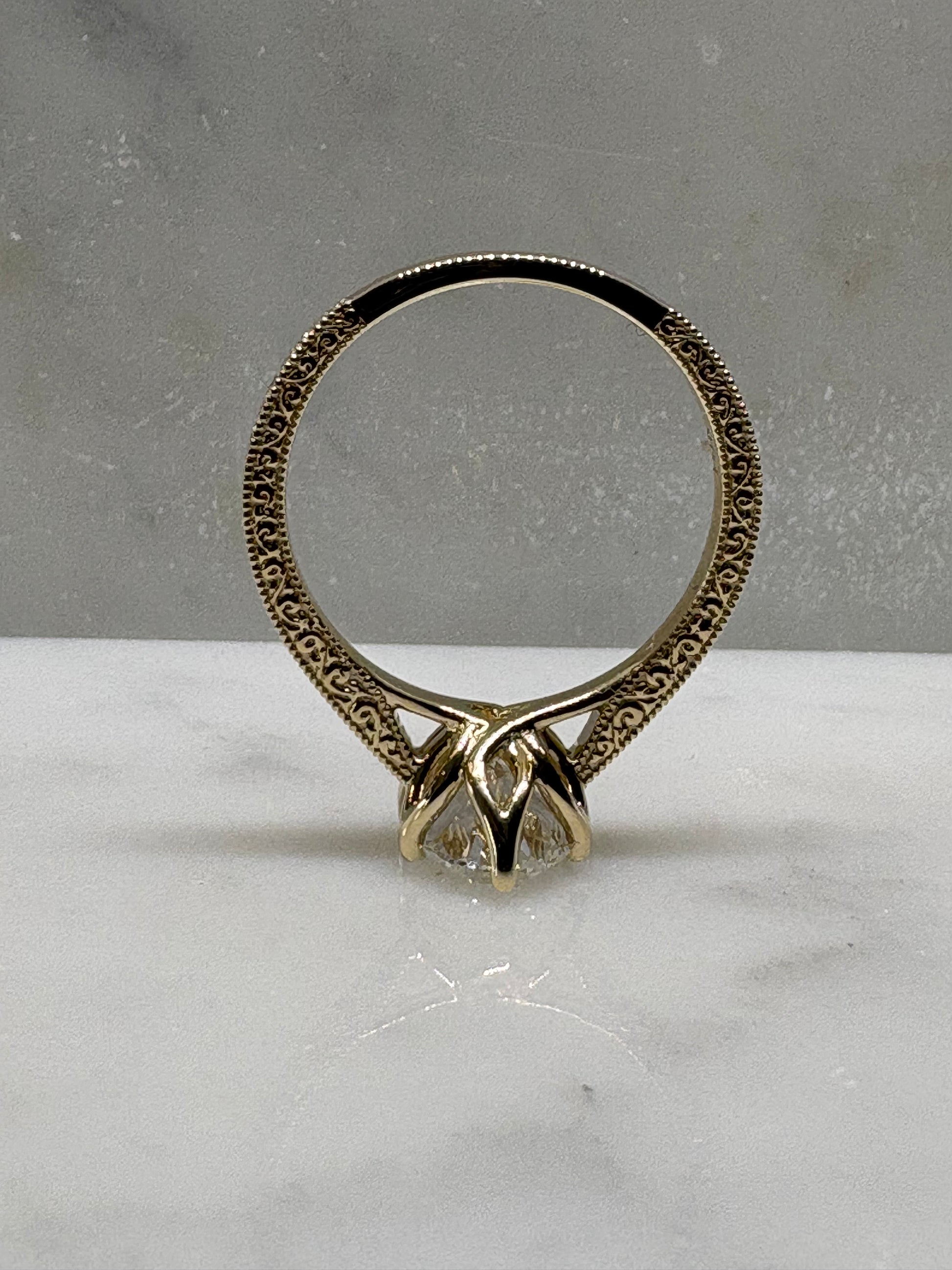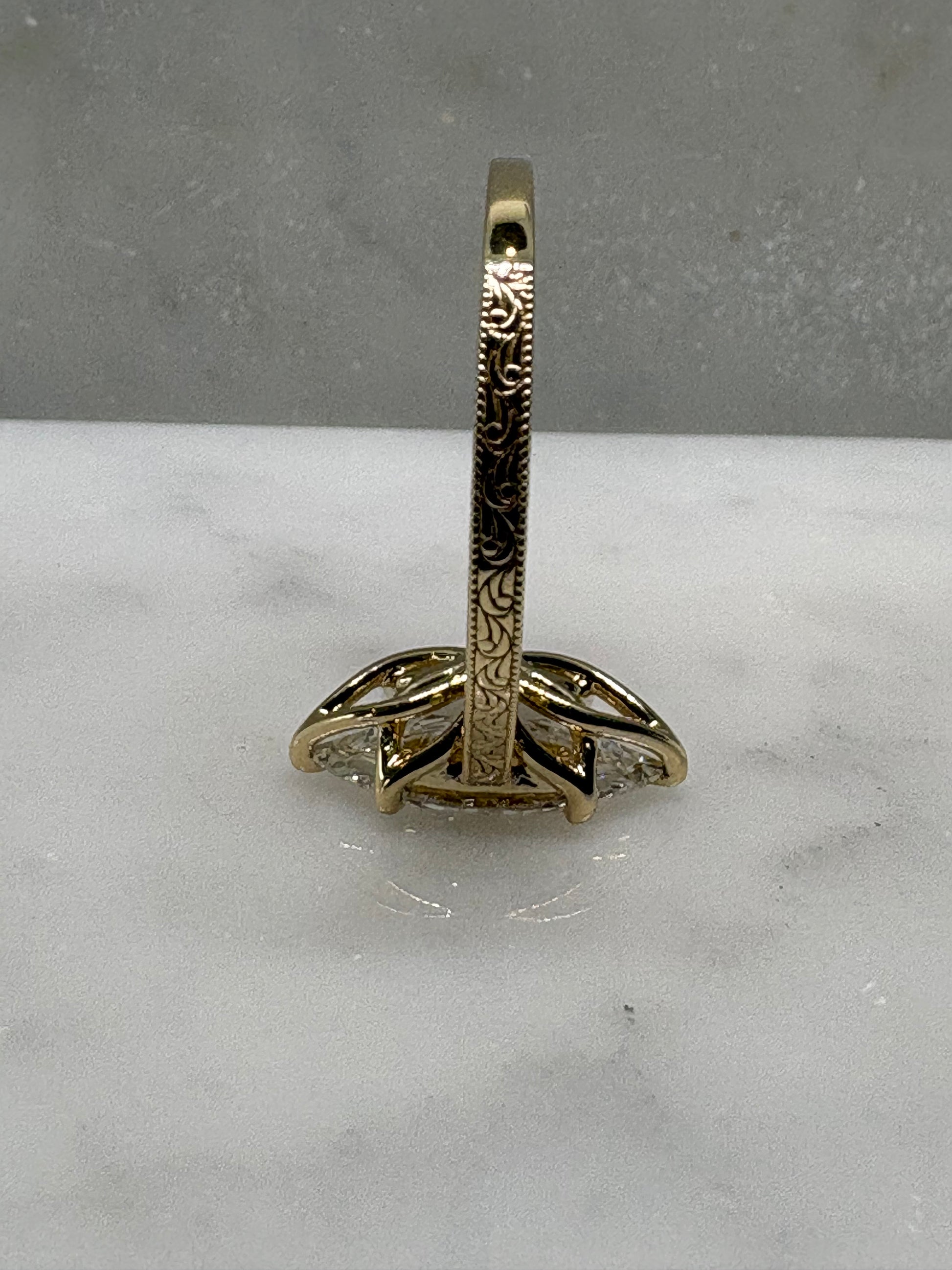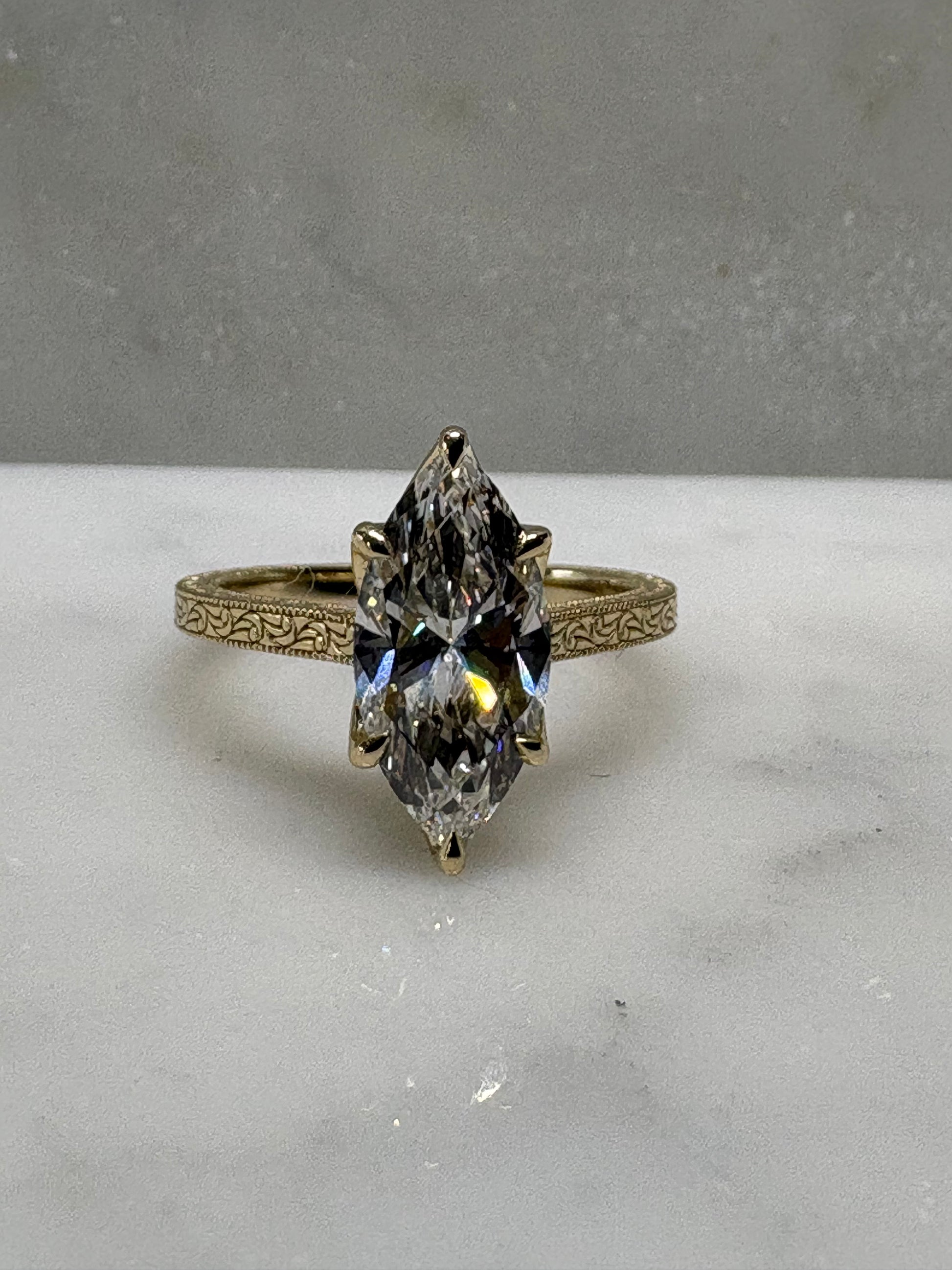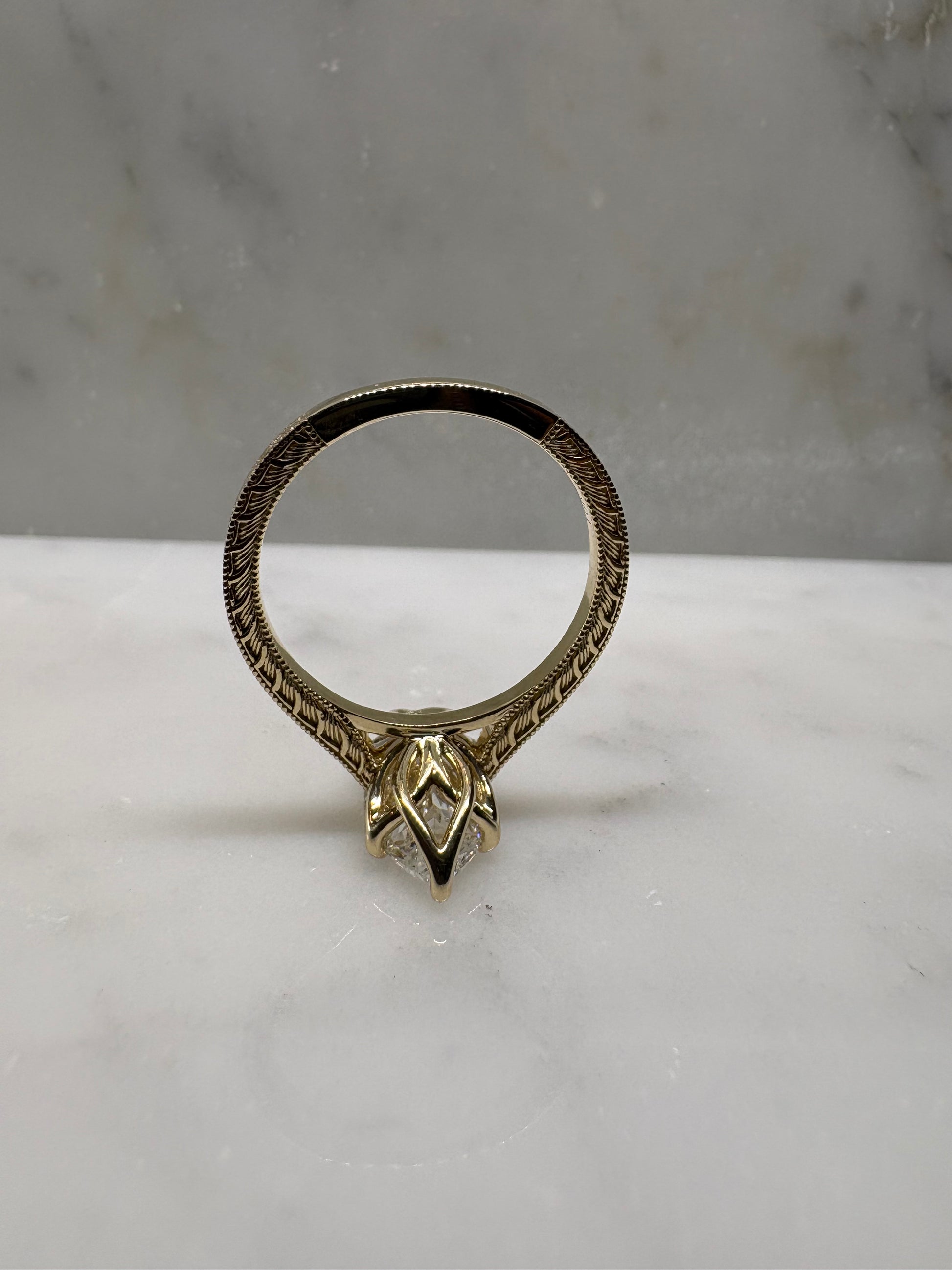 This ring features a 2.5 centre stone with a flower inspired bezel. Inspired by the Victorian era elevated form to show off the stunning centre done. The band is finished with continuous hand engraved detailing along the shoulders, echoing antique craftsmanship.