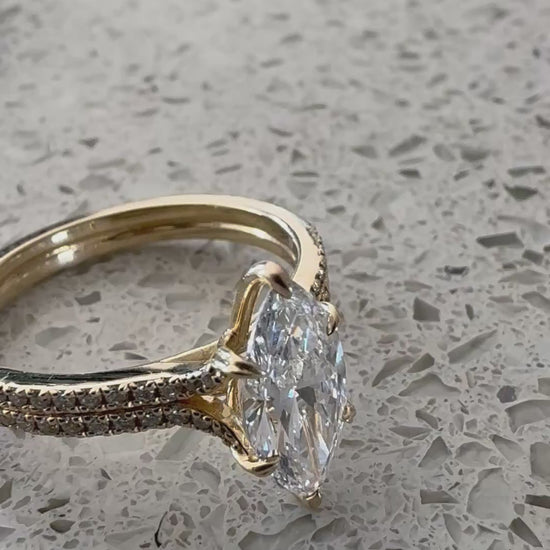 This striking marquise-cut diamond takes center stage, elegantly framed by a halo of 64 meticulously set diamonds that enhance its brilliance and elongate its silhouette. The surrounding stones amplify light from every angle, creating a refined, radiant design with timeless presence.
